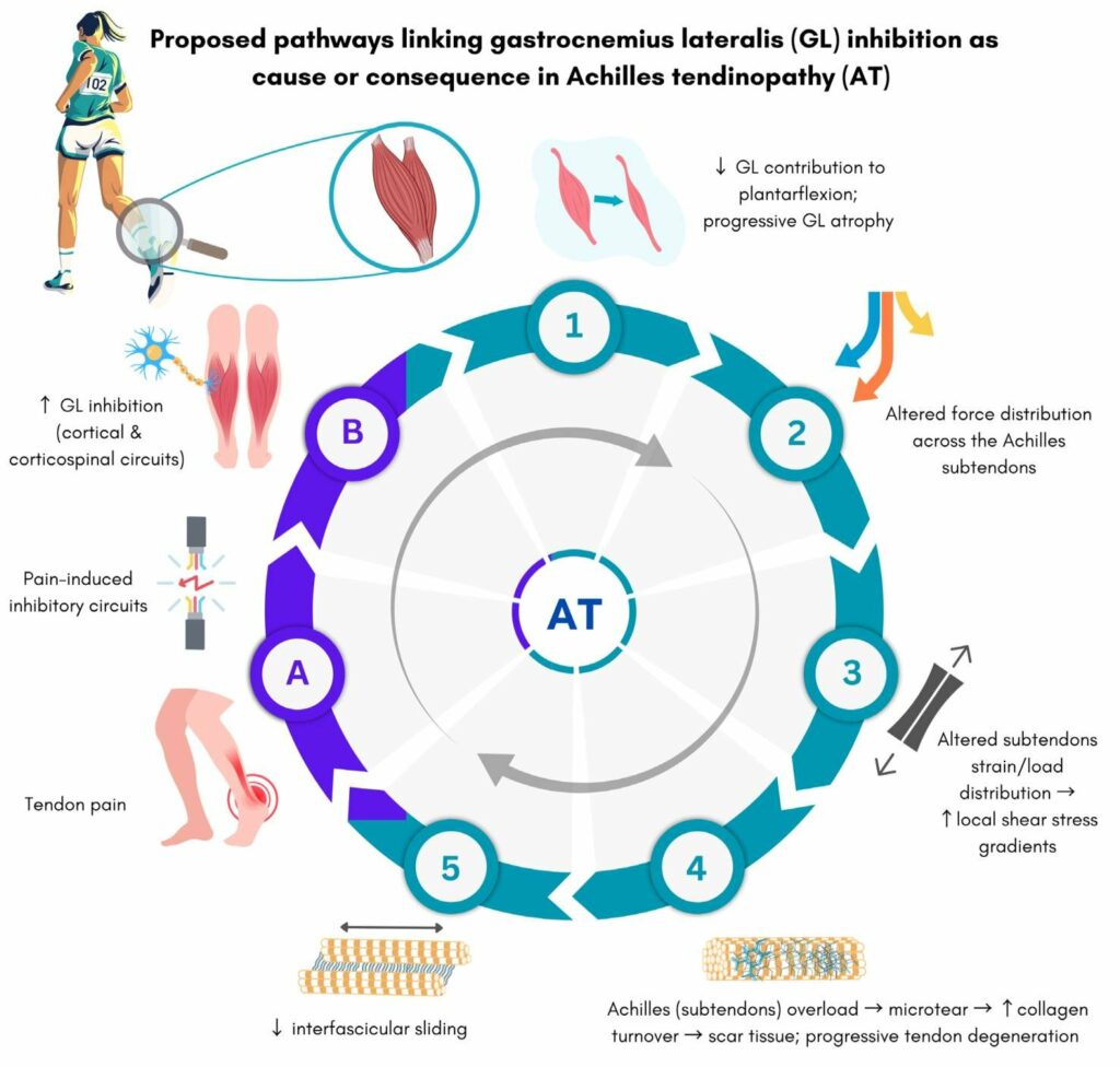 Gastrocnemius inhibitie kan zowel oorzaak als gevolg zijn van achillespeesklachten. Er zijn twee routes: